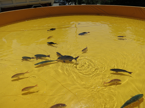 子どもたちがプールに入って、このお魚たちを取ります